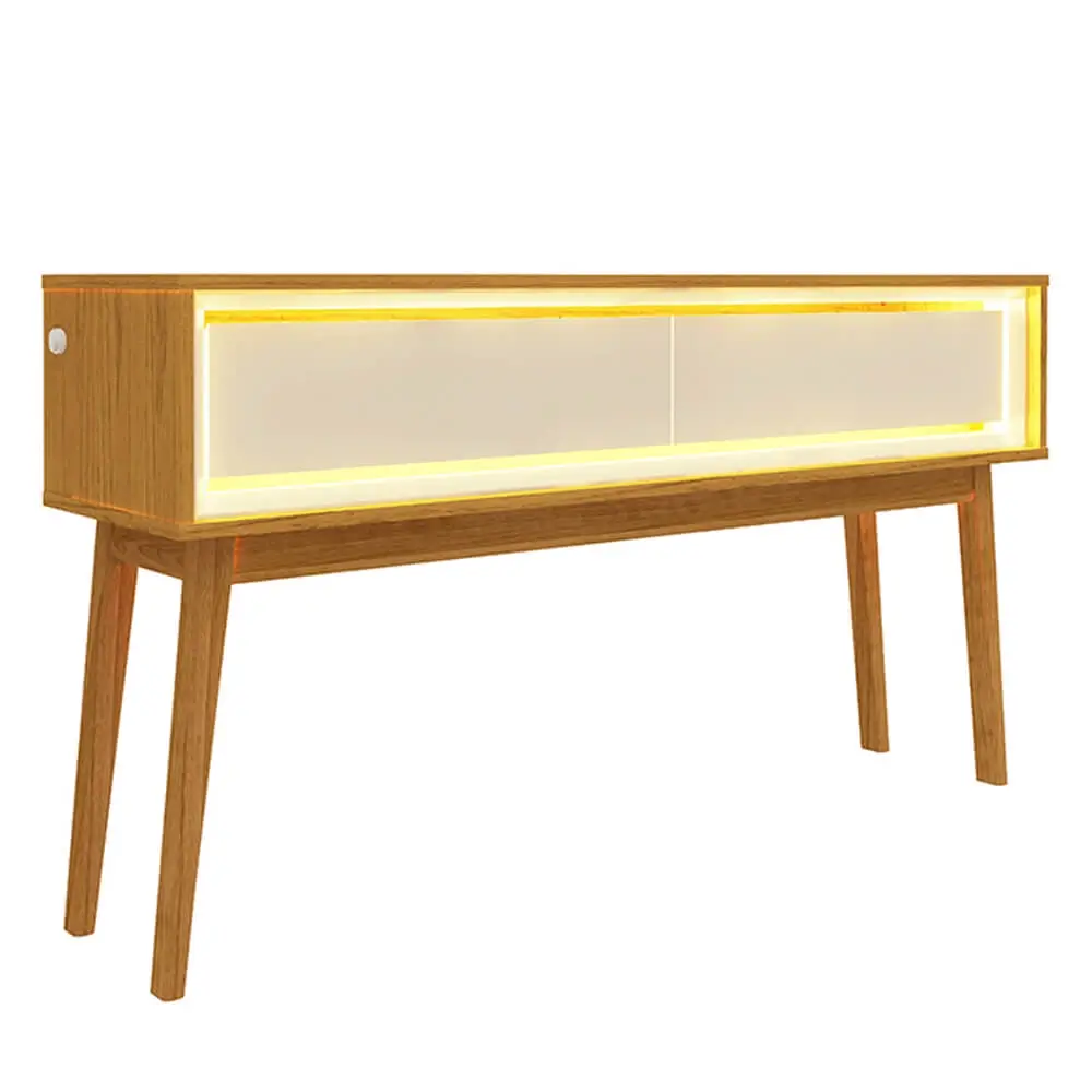 Uma peça moderna e versátil o Aparador Requinte 2 Gavetas com LED Gelius, possui pés altos de madeira maciça. Com gavetas espaçosas de design flutuante e corrediças telescópicas. O charme e praticidade se juntam em uma peça elegante com requadro interno na cor off White, gavetas de bordas chanfradas e laqueadas e luz neon em cor quente, trazendo aconchego para sua casa.