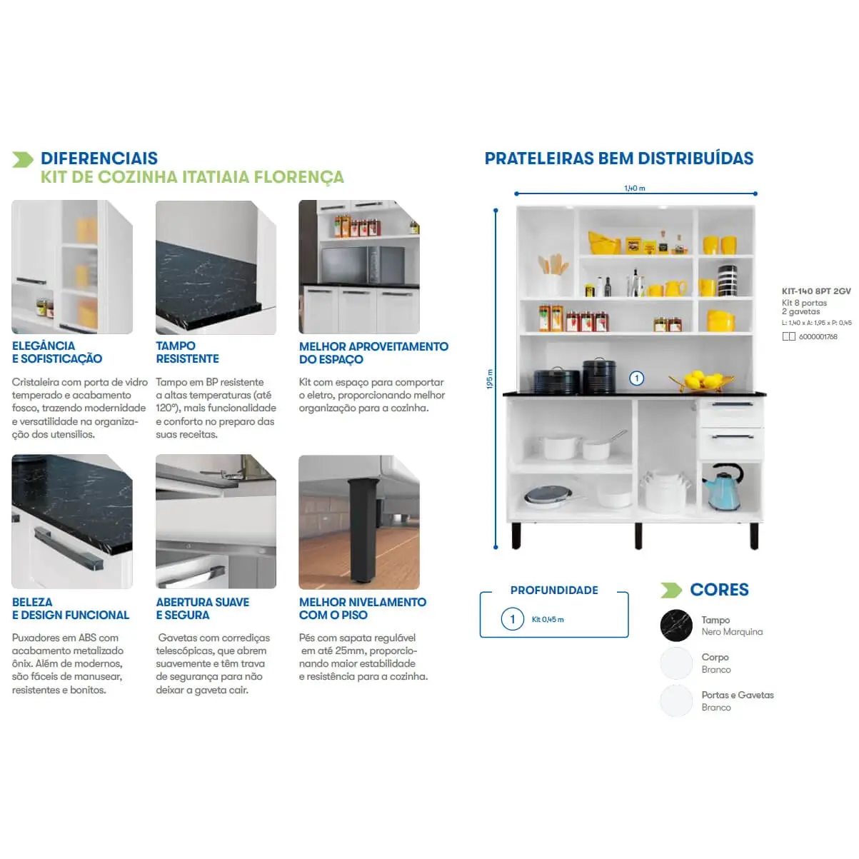 O Armário de Cozinha Florença 8 Portas 2 Gavetas Itatiaia é pura elegância e sofisticação. Cristaleira com porta de vidro temperado e acabamento fosco, trazendo modernidade e versatilidade na organização dos utensílios. Tampo resistente em bp que resiste a altas temperaturas (até 120°), mais funcionalidade e conforto no preparo das suas receitas. Espaço para comportar o eletro, proporcionando melhor organização para a cozinha. Beleza e design funcional. Puxadores em ABS com acabamento metalizado. Além de modernos, são fáceis de manusear, resistentes e bonitos. Gavetas com corrediças telescópicas, que abrem suavemente e têm trava de segurança para não deixar a gaveta cair.