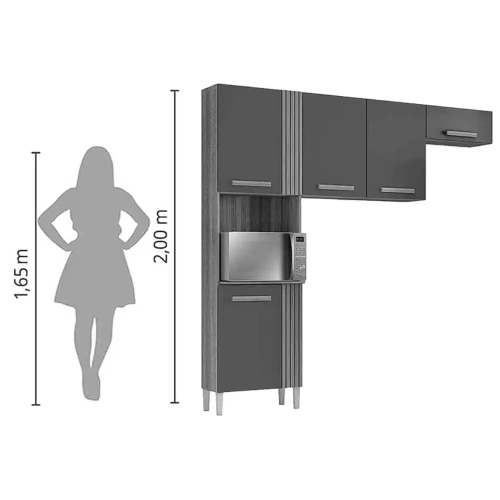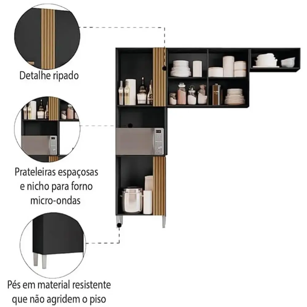 Seu amplo espaço interno é ideal para organizar tudo que precisa da maneira que desejar! Composta por um paneleiro com nicho, armário aéreo, armário de geladeira, e espaço para micro-ondas.