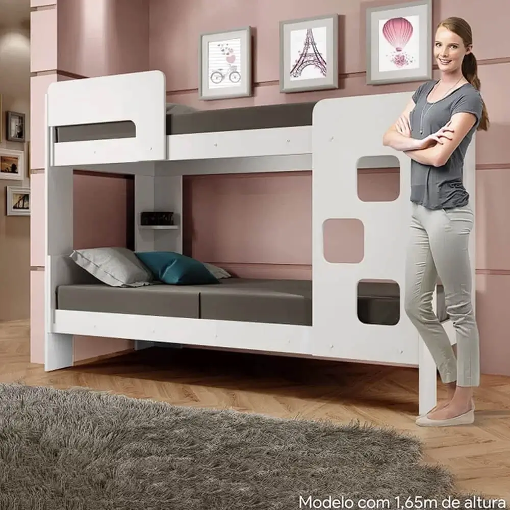 Sua escada é projetada na frente para facilitar o acesso à cama superior quando montada em ambiente apertado, pés e barras em MDF de 25mm dando total resistência e segurança durante o uso.