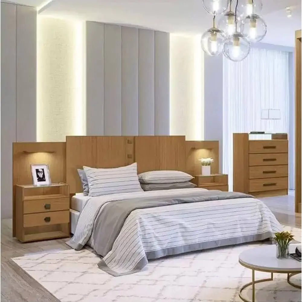 A Cabeceira Rubi Casal Queen com 2 Mesas de Cabeceira D Doro tem um design bonito para decorar seu quarto. Possui 2 mesas de cabeceira, 4 gavetas com corrediças telescópicas, 2 prateleiras com luminária e nichos para objetos.