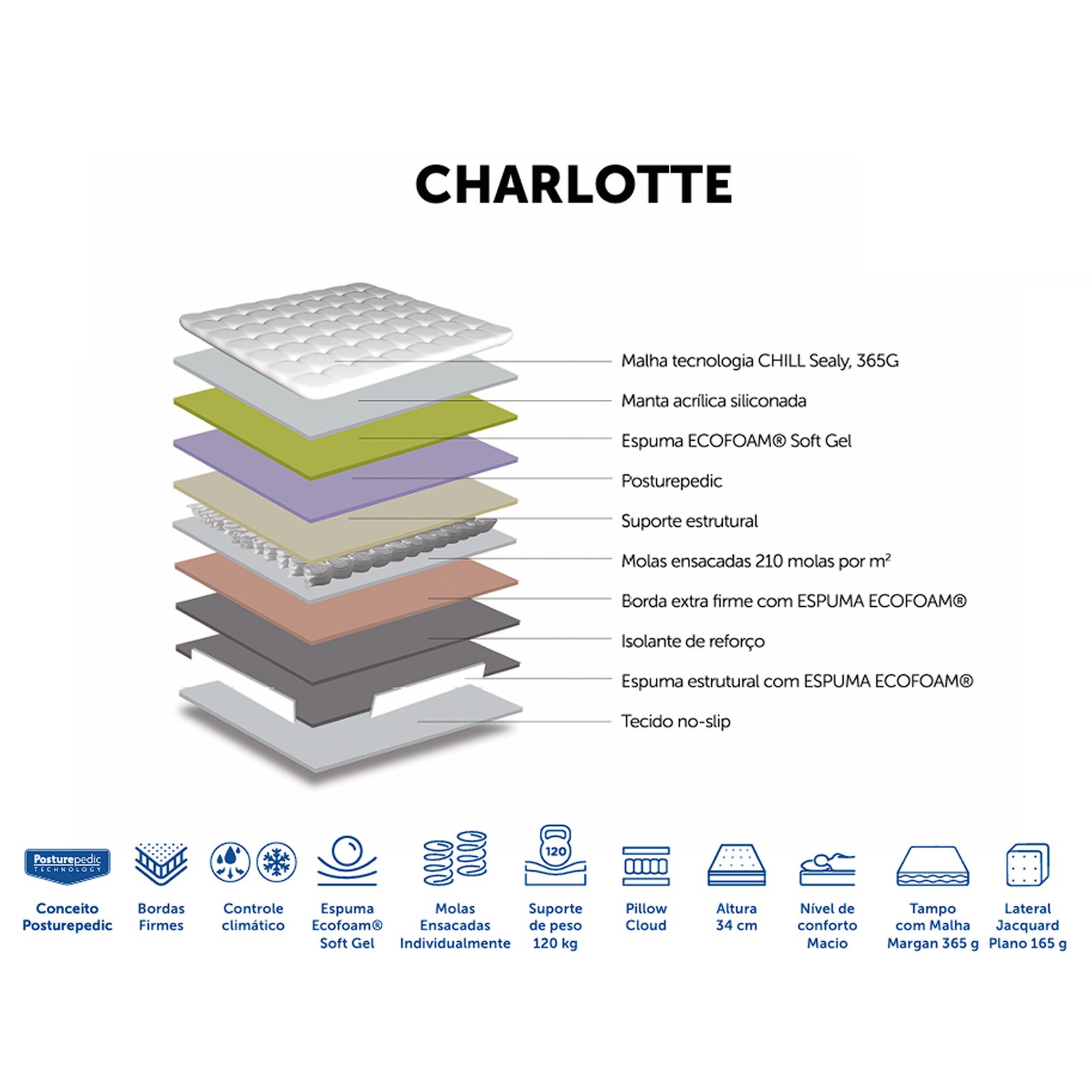 | Estrutura | Malha Tecnologia Chill Sealy, 365g, Manta Acrílica Siliconada, Espuma Ecofoam® Soft Gel, Posturepedic, Suporte Estrutural, Molas Ensacadas 210 Molas por M², Borda Extra Firme com Espuma Ecofoam®, Isolante de Reforço, Espuma Estrutural com Espuma Ecofoam®, Tecido No-slip |