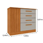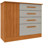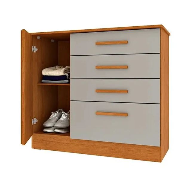 A cômoda conta com quatro gavetas espaçosas com corrediças telescópicas, garantindo um deslizar suave e seguro. Além disso, a porta com prateleira interna oferece um espaço extra para guardar itens maiores, como cobertores, edredons ou caixas organizadoras.