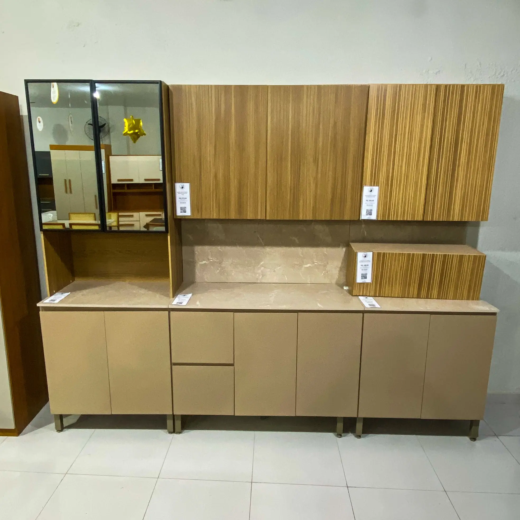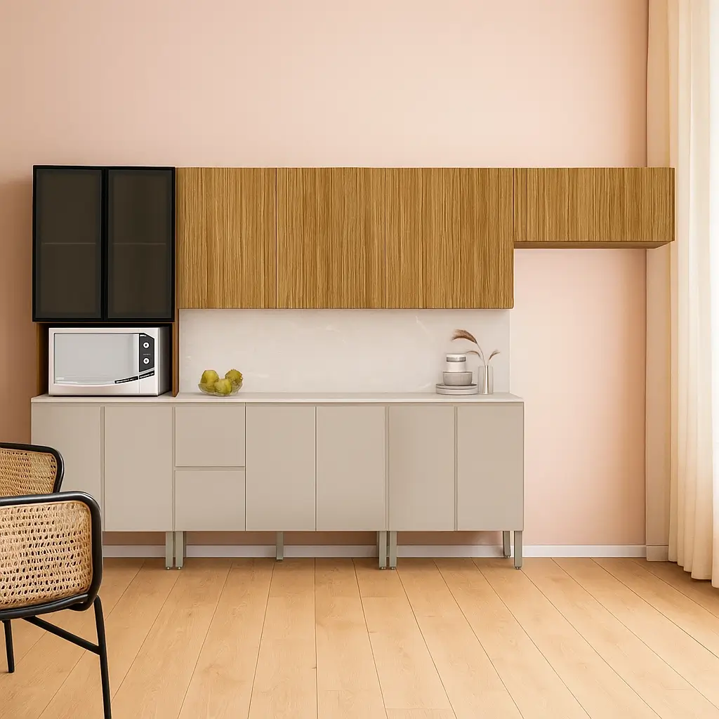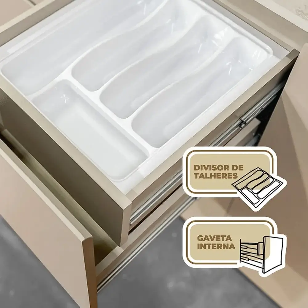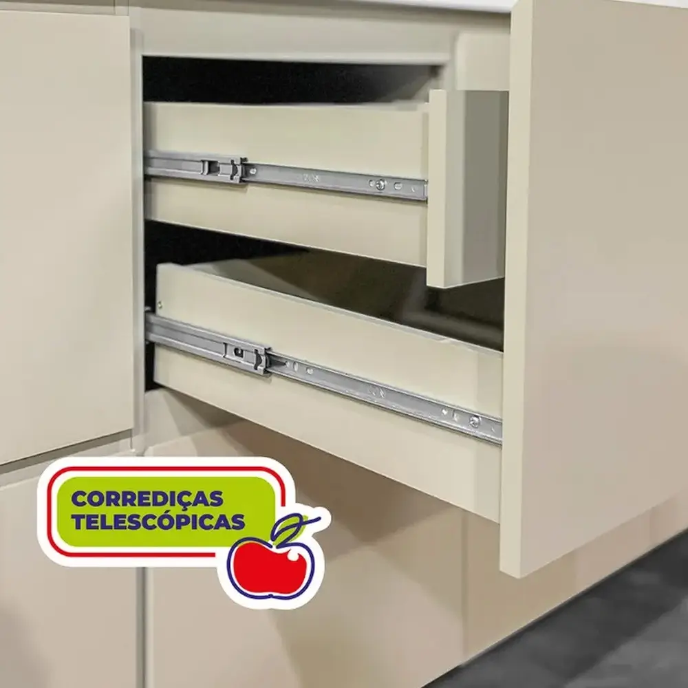 O conjunto inclui armários aéreos, paneleiro e balcões, com dobradiças com amortecimento e corrediças telescópicas, que asseguram um manuseio suave e eficiente das portas e gavetas, além de pés reguláveis para estabilidade, combinando funcionalidade e estética para uma cozinha moderna e bem organizada.