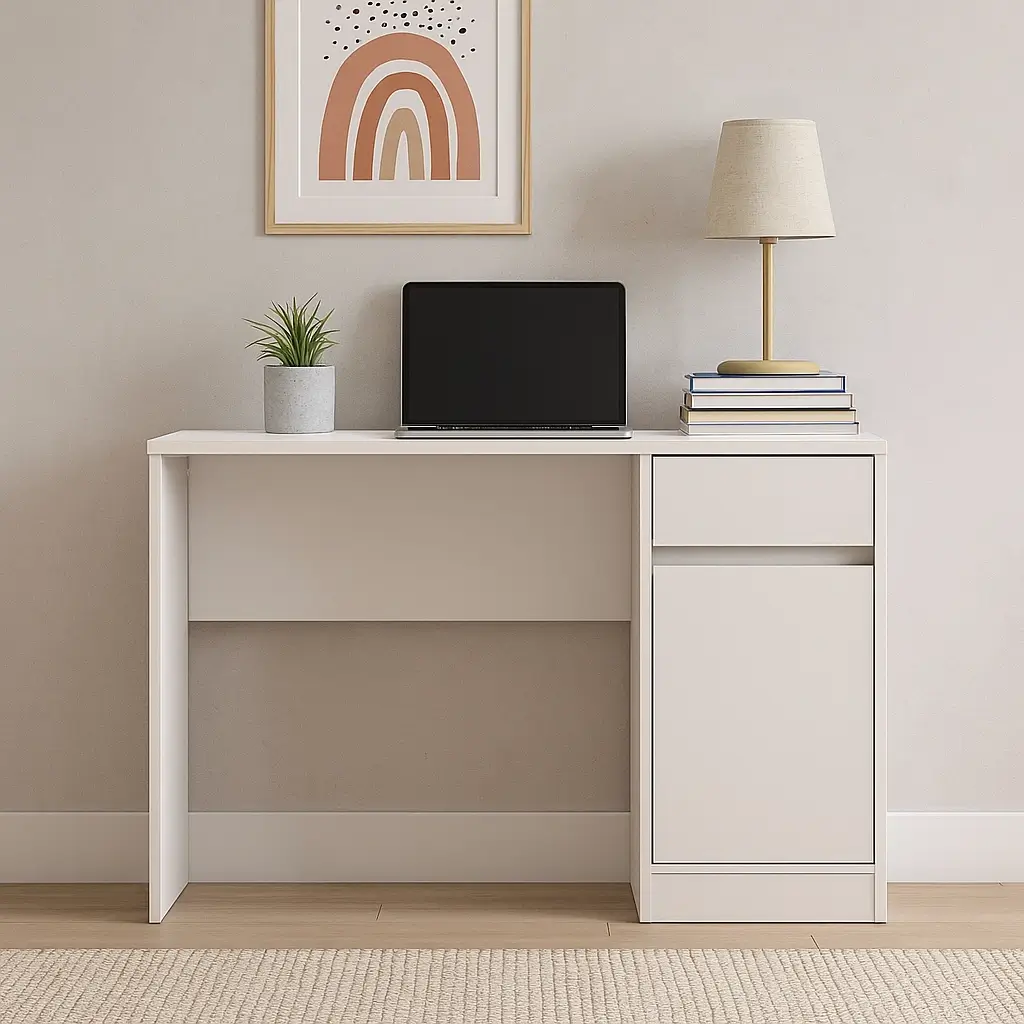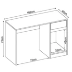 Esta escrivaninha conta com uma porta e uma gaveta, proporcionando um espaço discreto para guardar documentos, materiais de escritório e outros itens que você deseja manter organizados e fora da vista. A superfície espaçosa é ideal para acomodar seu notebook ou computador, livros e outros objetos necessários para suas tarefas.