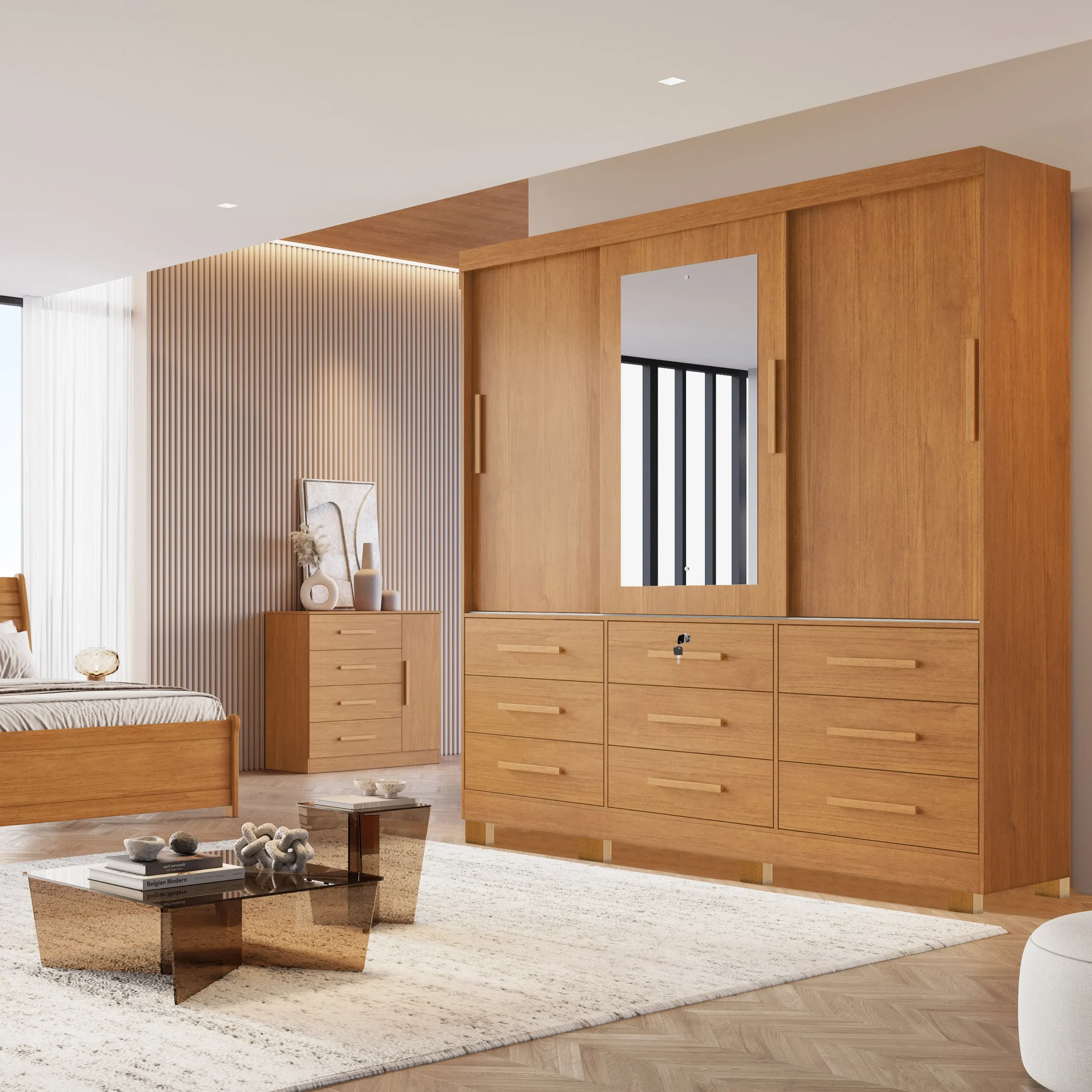 Além disso, o visual elegante e contemporâneo deste guarda-roupa adiciona um toque de sofisticação ao ambiente. Sua cor neutra combinará facilmente com a decoração do quarto, proporcionando um visual harmônico e aconchegante.
