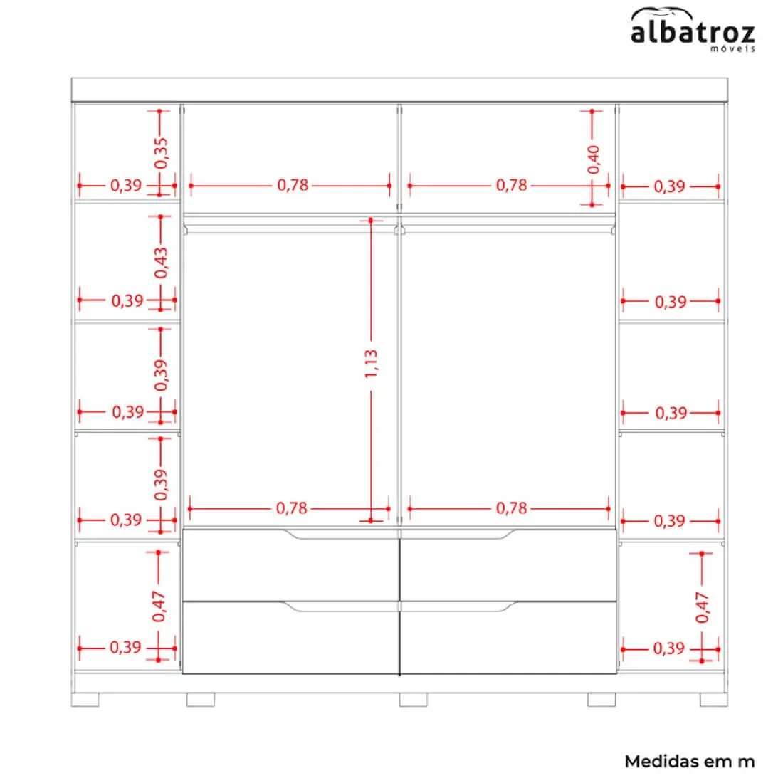 O modelo possui um amplo espaço interno para que você possa organizar todas as suas roupas, calçados e objetos pessoais. Além disso, seu design traz um toque de elegância para o seu quarto. Com a qualidade Albatroz, este guarda roupa é feito para durar. Sua estrutura é resistente e robusta, garantindo que você tenha um móvel confiável por muitos anos.