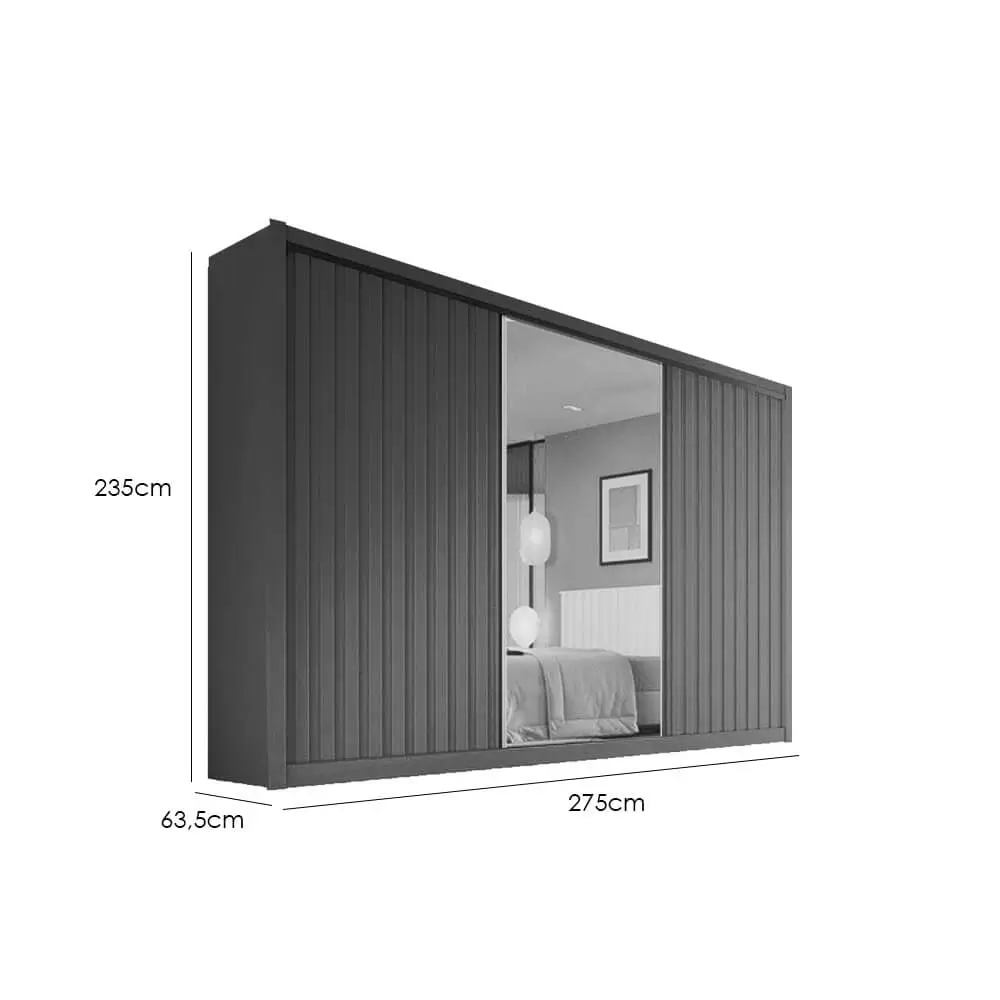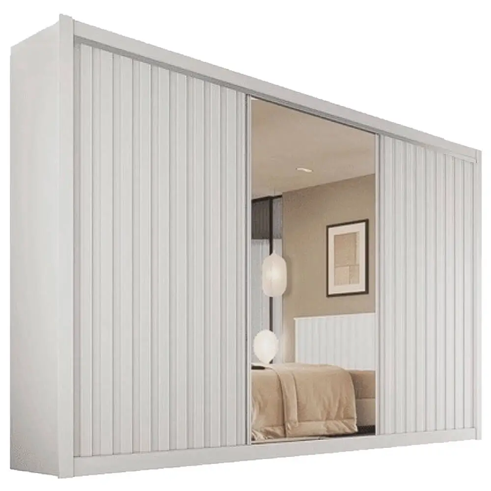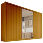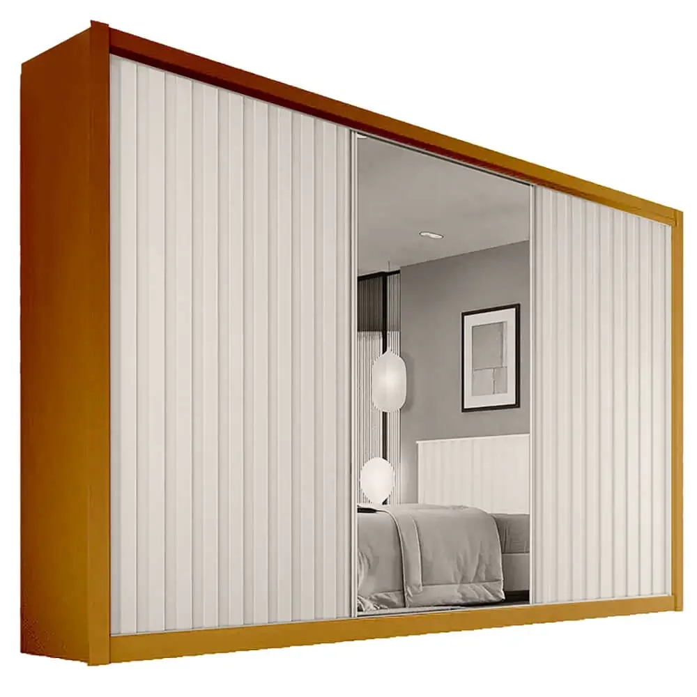 O Guarda Roupa York Casal com Espelho 3 Portas 6 Gavetas Europa é perfeito para casais! Um modelo lindo com 3 portas de correr; além do acabamento ripado e ser super sofisticado. O espaço interno é dividido entre “ELE” e “ELA”. Com duas gavetas internas com chave e mais quatro gavetas com corrediças telescópicas. Possui prateleiras removíveis e cabideiros e calçadeiras espaçosos em aluminio.