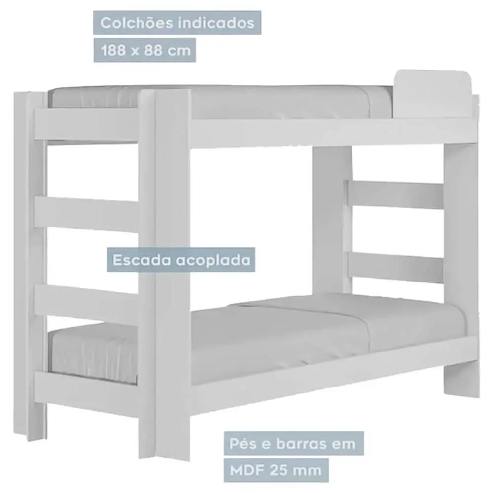 Prático, confortável e compacto, é assim que o ambiente do seu quarto vai ficar com o Kit Beliche Florida com 2 Colchões Solteiro D20 88×188. Produzido em cores neutras, para proporcionar um ambiente mais clássico e atual. A estrutura é feita em MDF, garantido mais resistência e durabilidade. O beliche possui escada e 2 camas de solteiro deixando o local mais formoso e organizado. O acabamento fica por conta da pintura U.V.
