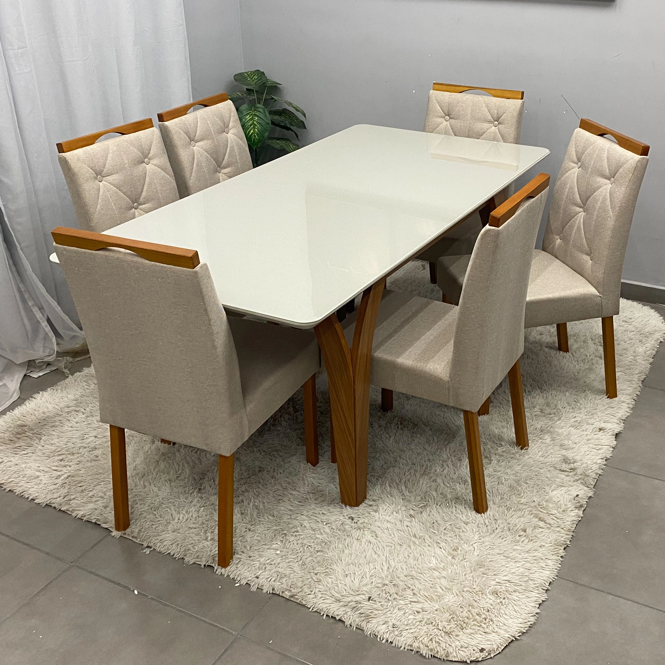 Modelo Mesa de Jantar Agata 180x90cm com Vidro e 6 Cadeiras Jasmim em Linho