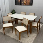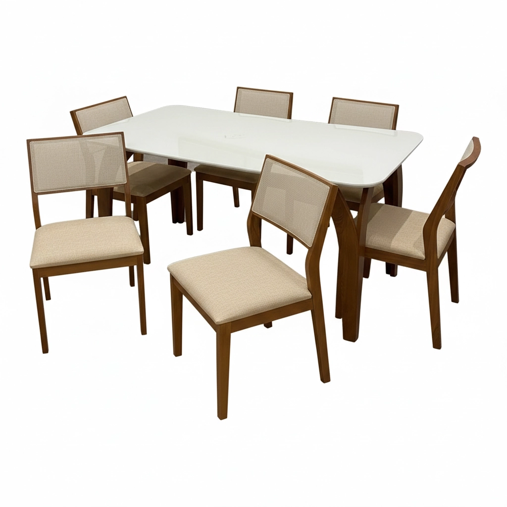 | Modelo | Mesa de Jantar Agata 180x90cm com Vidro e 6 Cadeiras Oiti em Linho |