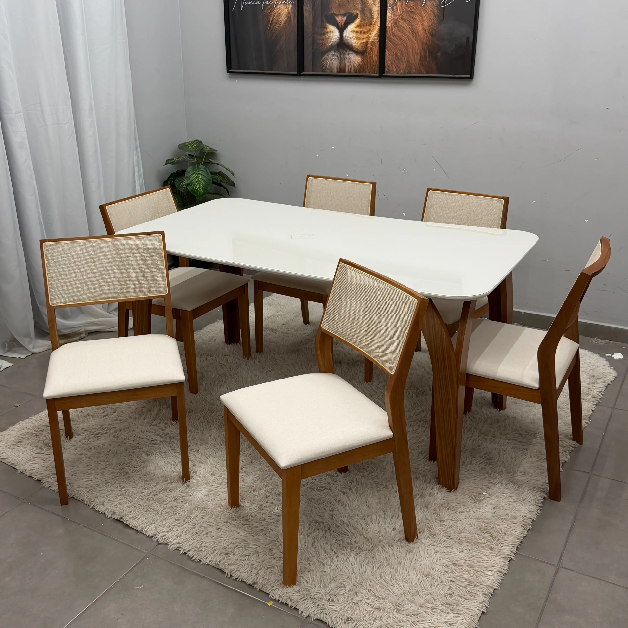 Mesa de Jantar Agata 180x90cm com Vidro e 6 Cadeiras Oiti em Linho Madeira LJ Móveis