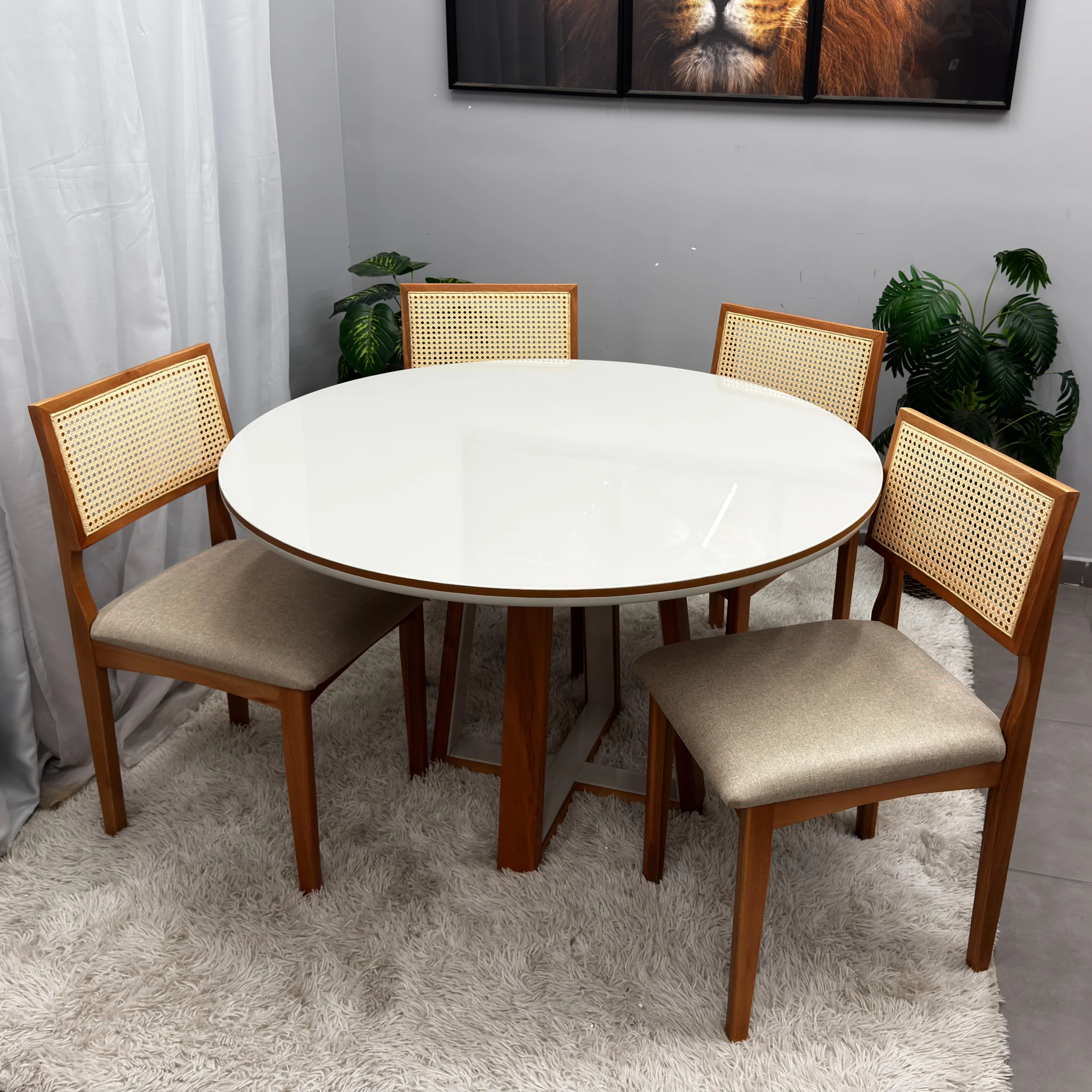 Mesa de Jantar Atlanta 100cm Redonda com Vidro e 4 Cadeiras Monalisa em Linho Madeira Minas Plac