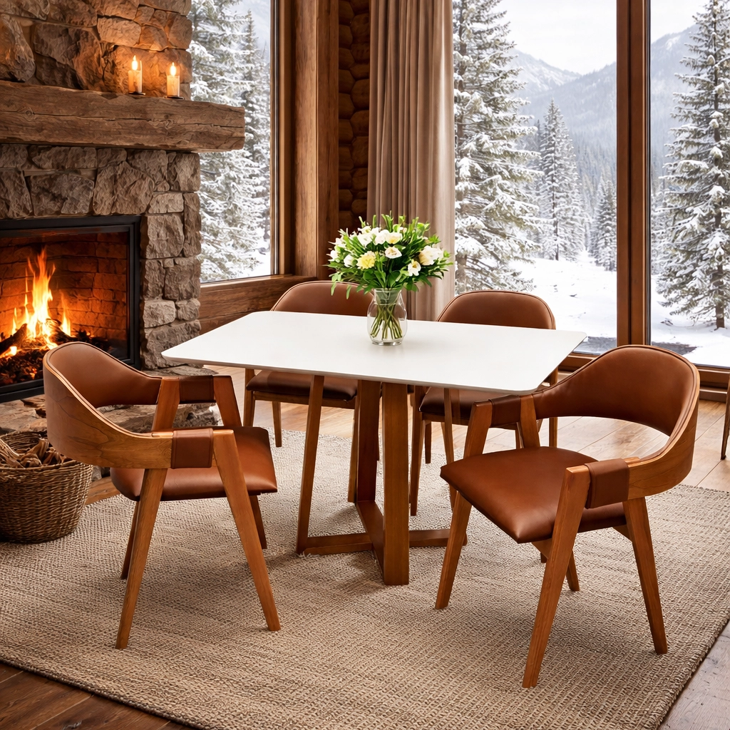 Mesa de Jantar Bali 120x90cm com Vidro e 4 Cadeiras Perola em Corino Madeira Minas Plac