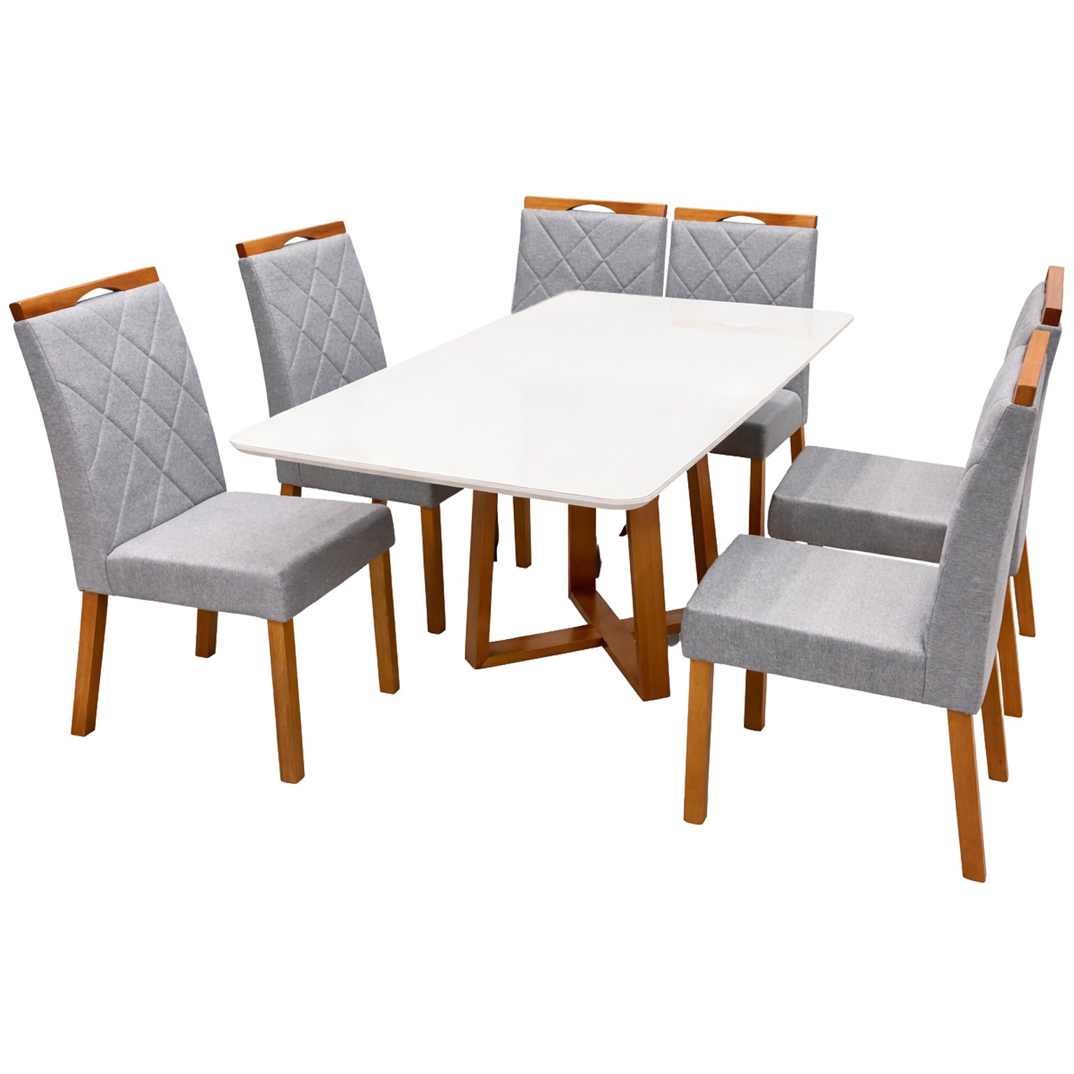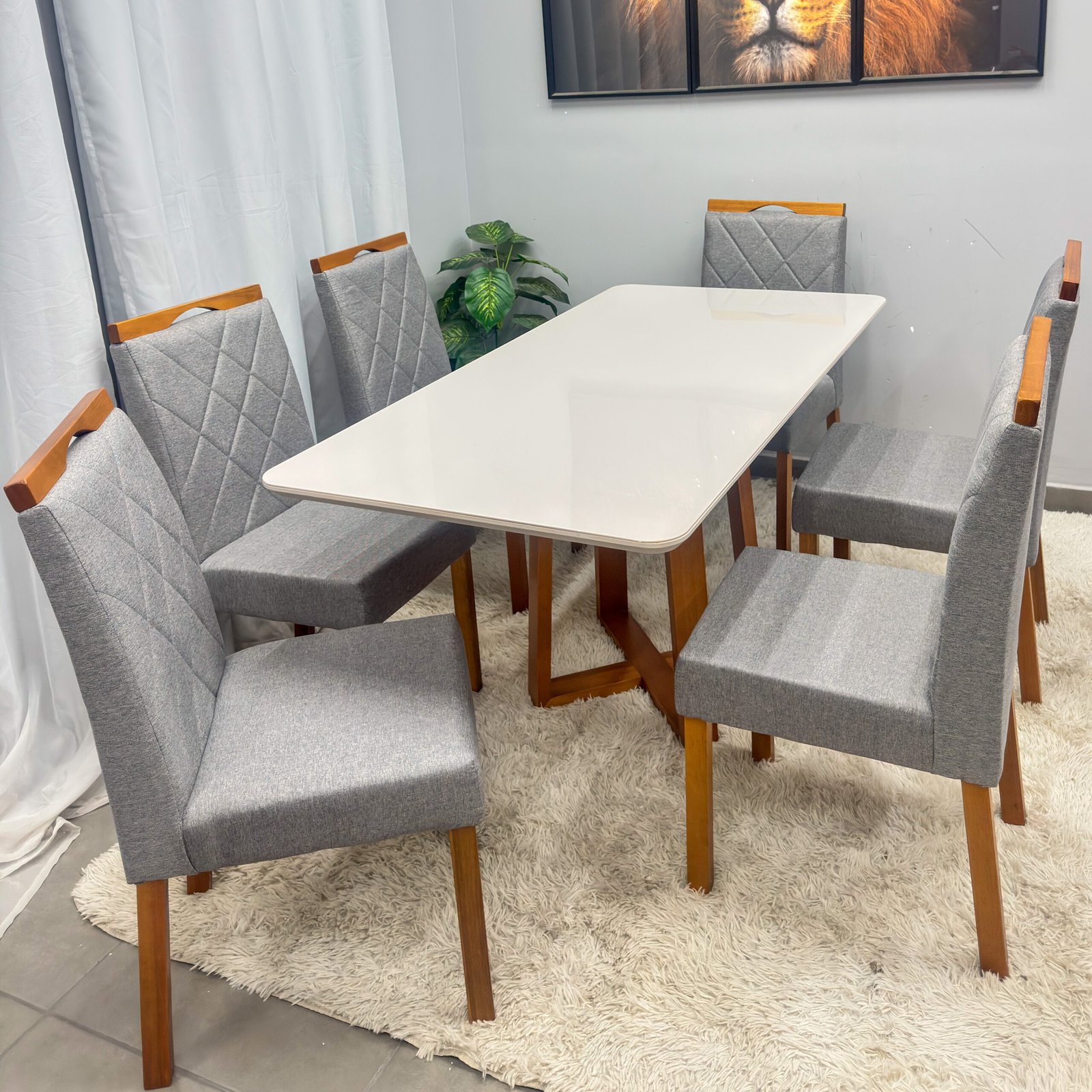 | Modelo | Mesa de Jantar Bali 160x90cm com Vidro e 6 Cadeiras California em Linho Estofadas Minas Plac |