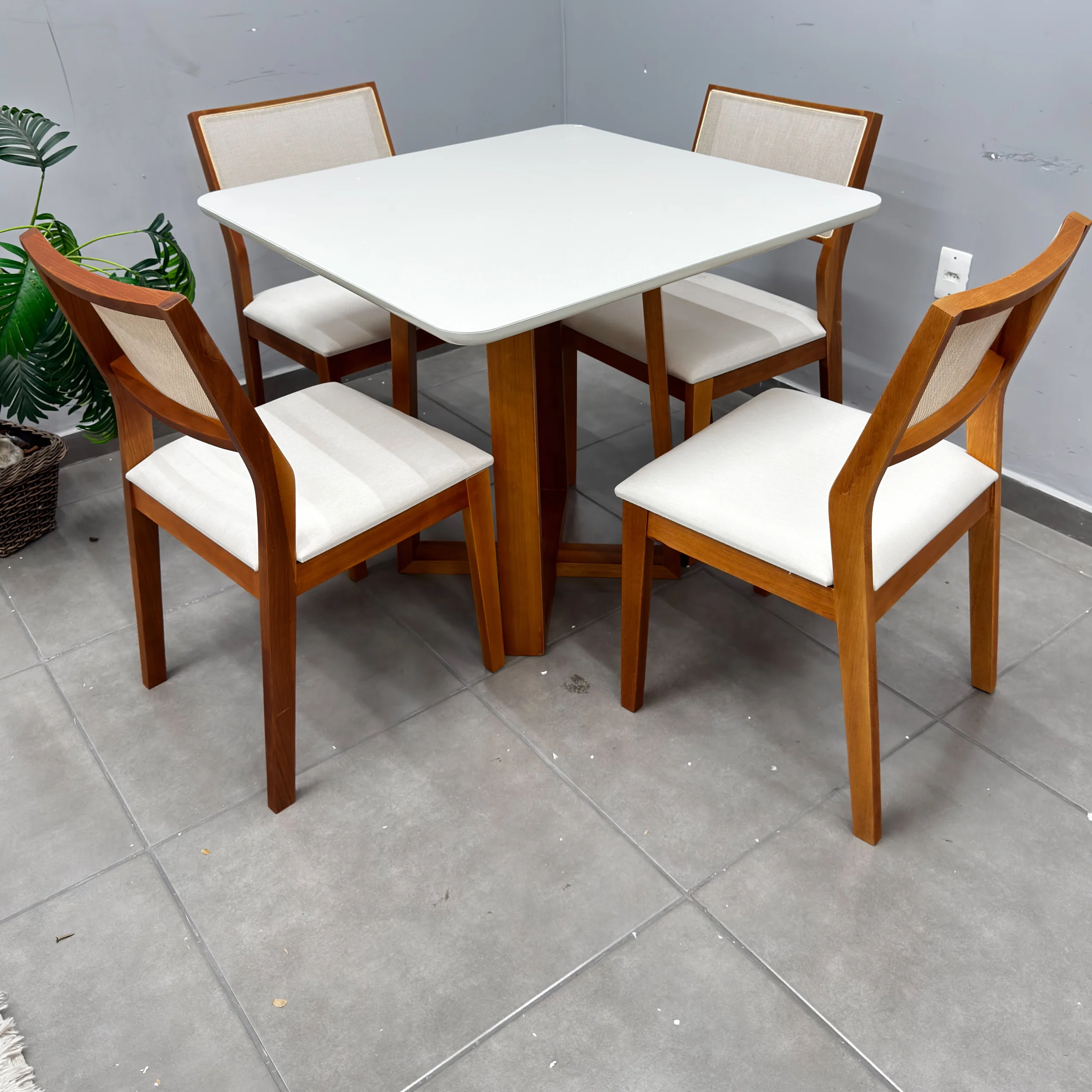 | Modelo | Mesa de Jantar Bali 90x90cm com Vidro e 4 Cadeiras Oiti em Linho Madeira Minas Plac |