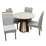 A Mesa de Jantar Berlim 100cm Redonda com Vidro e 4 Cadeiras Giulia em Linho Estofadas Cel Móveis une sofisticação e funcionalidade, apresentando um tampo redondo com acabamento em vidro que amplia visualmente o ambiente e facilita a limpeza. O conjunto acompanha 4 cadeiras, que garantem o máximo conforto através de um estofado macio, conferindo um toque luxuoso e acolhedor à sua sala de jantar. Com um design moderno e estrutura resistente, este kit é a escolha ideal para quem busca otimizar espaços reduzidos sem abrir mão da elegância e do bem-estar durante as refeições.