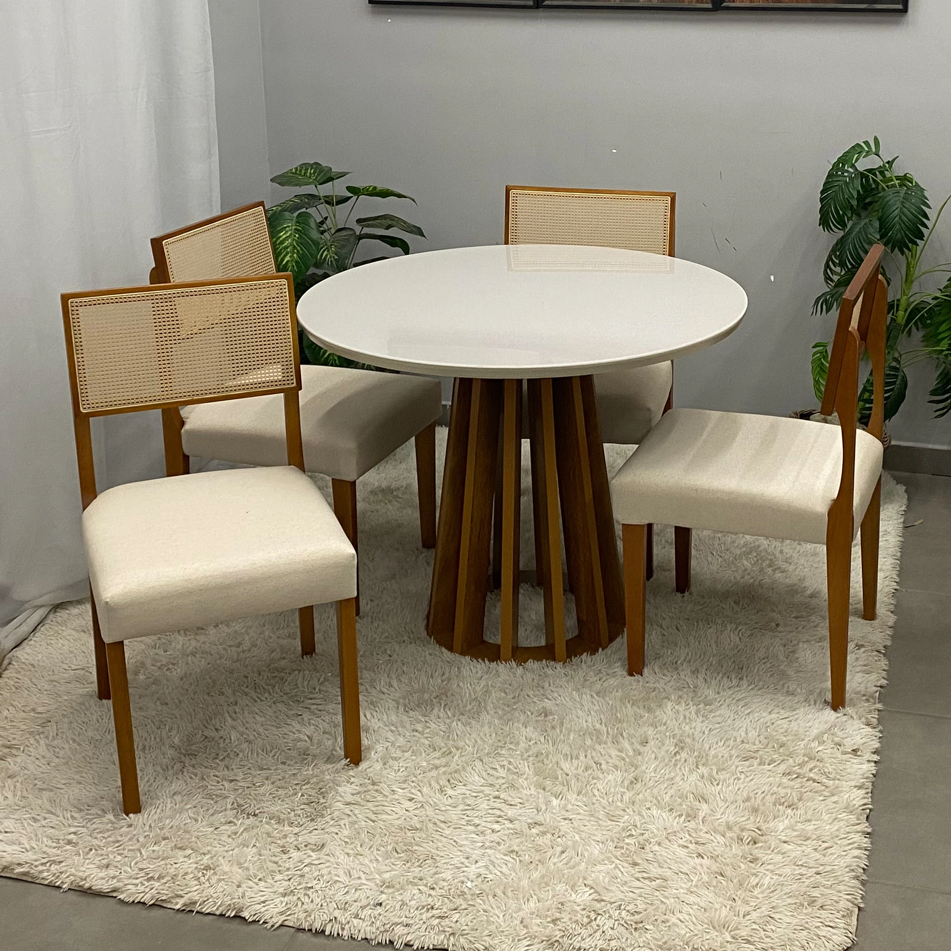 Seja o primeiro a avaliar “Mesa de Jantar Berlim 100cm Redonda com Vidro e 4 Cadeiras Grecia em Linho Madeira Cel Móveis”