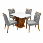 O conjunto acompanha 4 cadeiras, projetadas para proporcionar uma experiência de máximo conforto. Combinando robustez e sofisticação, este conjunto apresenta um acabamento refinado que harmoniza com diversos estilos de decoração, do clássico ao contemporâneo. É a peça central que faltava para renovar seu ambiente com qualidade superior e um visual impecável que impressiona as visitas.