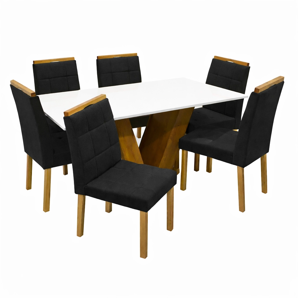 O conjunto acompanha 6 cadeiras, projetadas para proporcionar uma experiência de máximo conforto. Combinando robustez e sofisticação, este conjunto apresenta um acabamento refinado que harmoniza com diversos estilos de decoração, do clássico ao contemporâneo. É a peça central que faltava para renovar seu ambiente com qualidade superior e um visual impecável que impressiona as visitas.