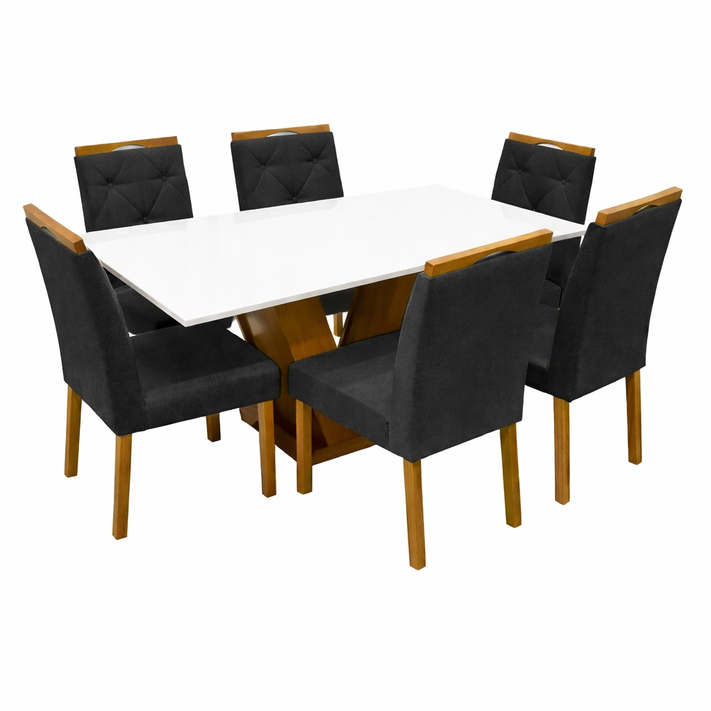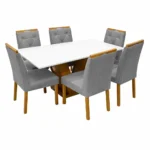 O conjunto acompanha 6 cadeiras, projetadas para proporcionar uma experiência de máximo conforto. Combinando robustez e sofisticação, este conjunto apresenta um acabamento refinado que harmoniza com diversos estilos de decoração, do clássico ao contemporâneo. É a peça central que faltava para renovar seu ambiente com qualidade superior e um visual impecável que impressiona as visitas.