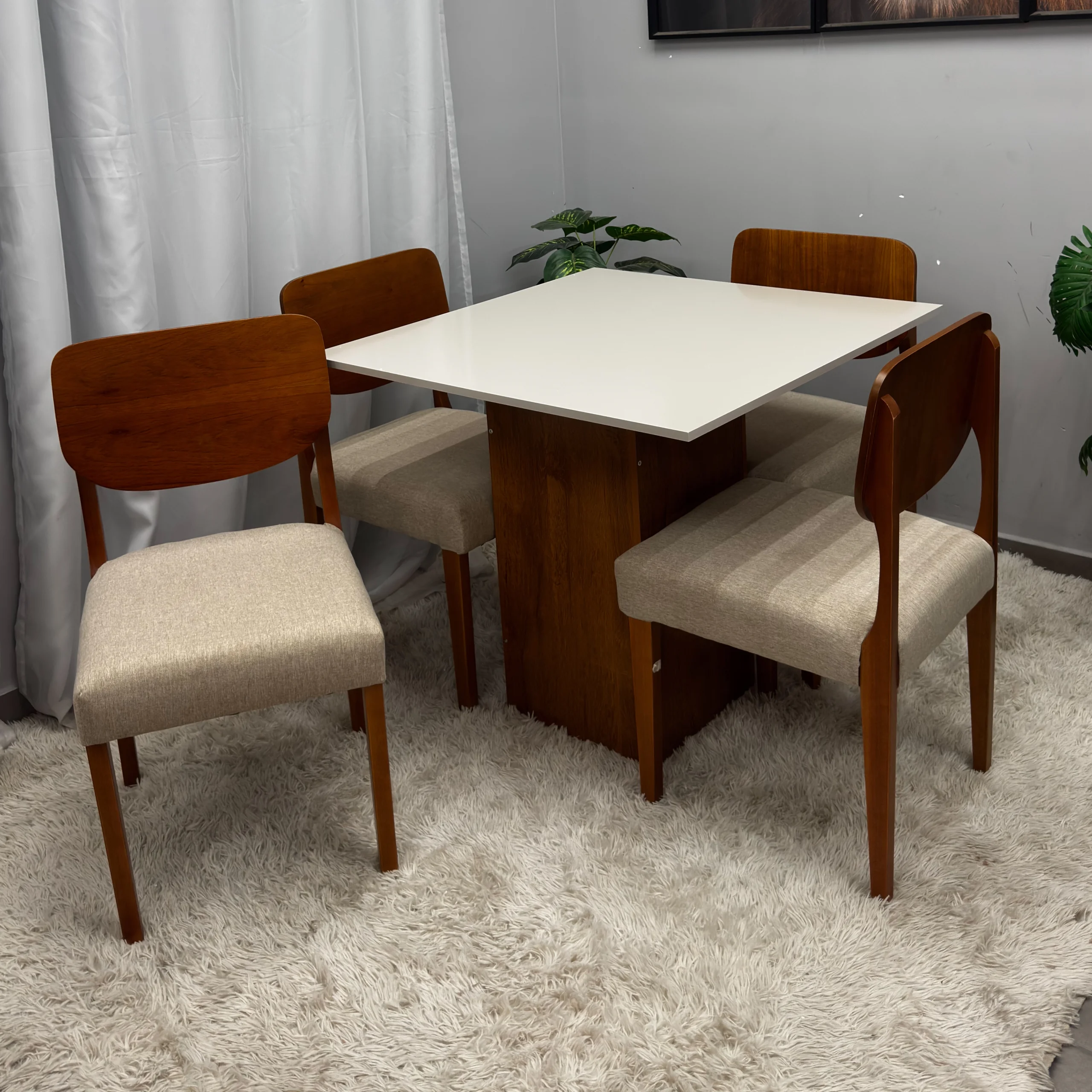 Mesa de Jantar Dakota 90x90cm SEM Vidro e 4 Cadeiras Barcelona em Linho Madeira Cel Móveis