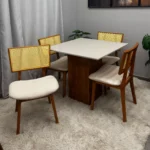 A Mesa de Jantar Dakota 90x90cm SEM Vidro e 4 Cadeiras Livia em Linho Madeira Cel Móveis, com seu formato quadrado e tampo amadeirado sem vidro, é a escolha ideal para quem busca otimizar espaços pequenos sem abrir mão da elegância e do aconchego. O conjunto acompanha 4 cadeiras, que se destacam pelo conforto, conferindo um toque suave e um visual sofisticado ao ambiente. O conjunto une durabilidade e um design clean, sendo perfeito para criar uma sala de jantar moderna, prática e convidativa para as refeições do dia a dia.