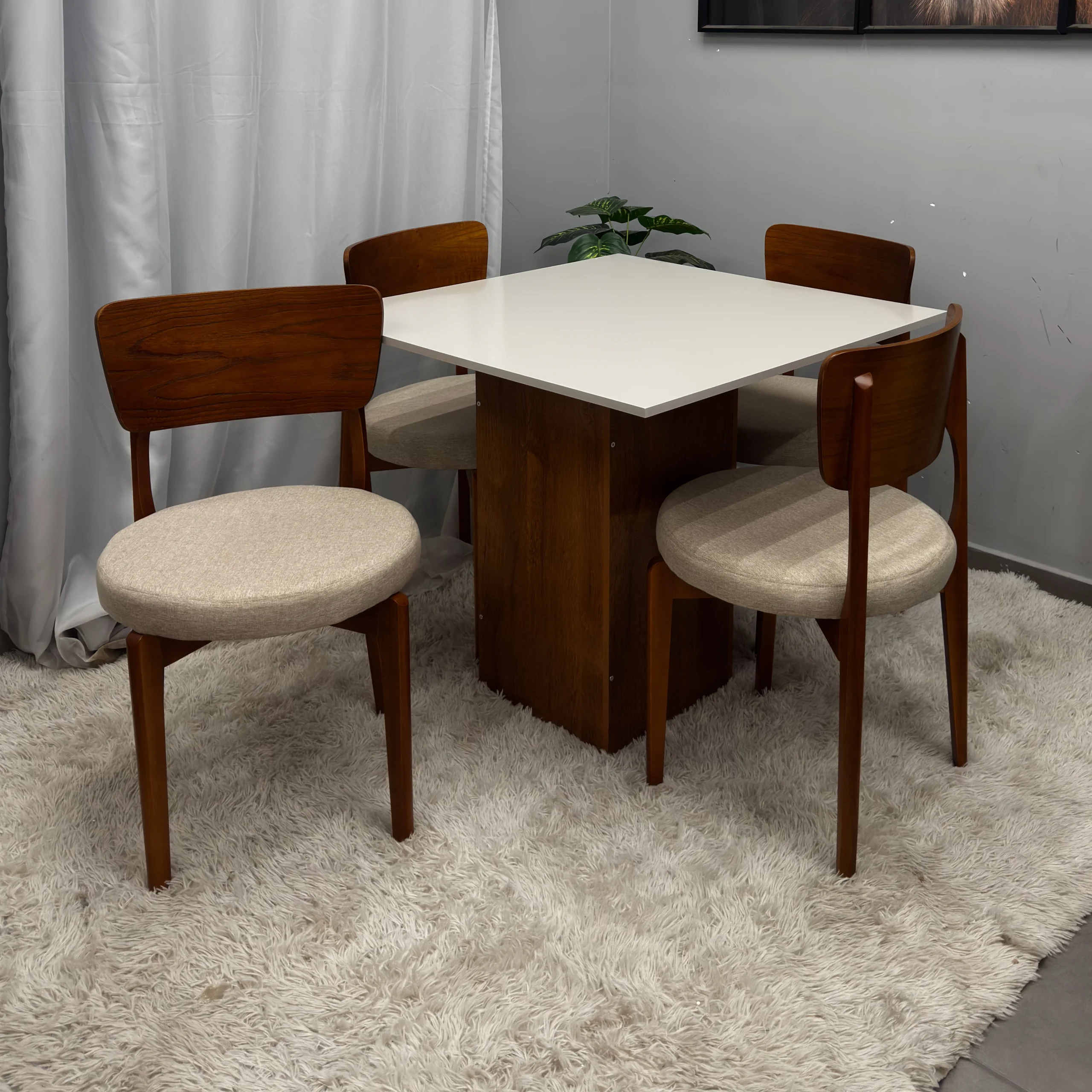 A Mesa de Jantar Dakota 90x90cm SEM Vidro e 4 Cadeiras Maldivas em Linho Madeira Cel Móveis, com seu formato quadrado e tampo amadeirado sem vidro, é a escolha ideal para quem busca otimizar espaços pequenos sem abrir mão da elegância e do aconchego. O conjunto acompanha 4 cadeiras, que se destacam pelo conforto, conferindo um toque suave e um visual sofisticado ao ambiente. O conjunto une durabilidade e um design clean, sendo perfeito para criar uma sala de jantar moderna, prática e convidativa para as refeições do dia a dia.