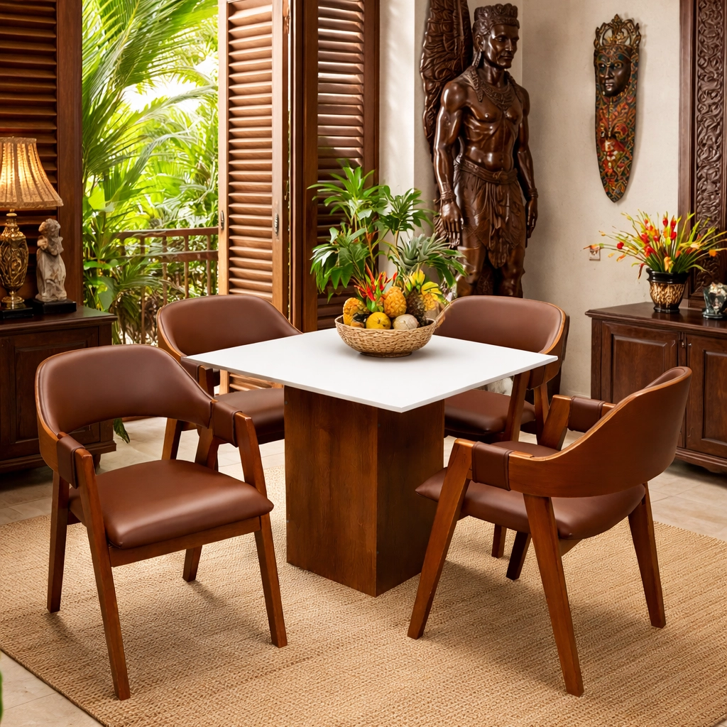 A Mesa de Jantar Dakota 90x90cm SEM Vidro e 4 Cadeiras Perola em Corino Madeira Cel Móveis, com seu formato quadrado e tampo amadeirado sem vidro, é a escolha ideal para quem busca otimizar espaços pequenos sem abrir mão da elegância e do aconchego. O conjunto acompanha 4 cadeiras, que se destacam pelo conforto, conferindo um toque suave e um visual sofisticado ao ambiente. O conjunto une durabilidade e um design clean, sendo perfeito para criar uma sala de jantar moderna, prática e convidativa para as refeições do dia a dia.