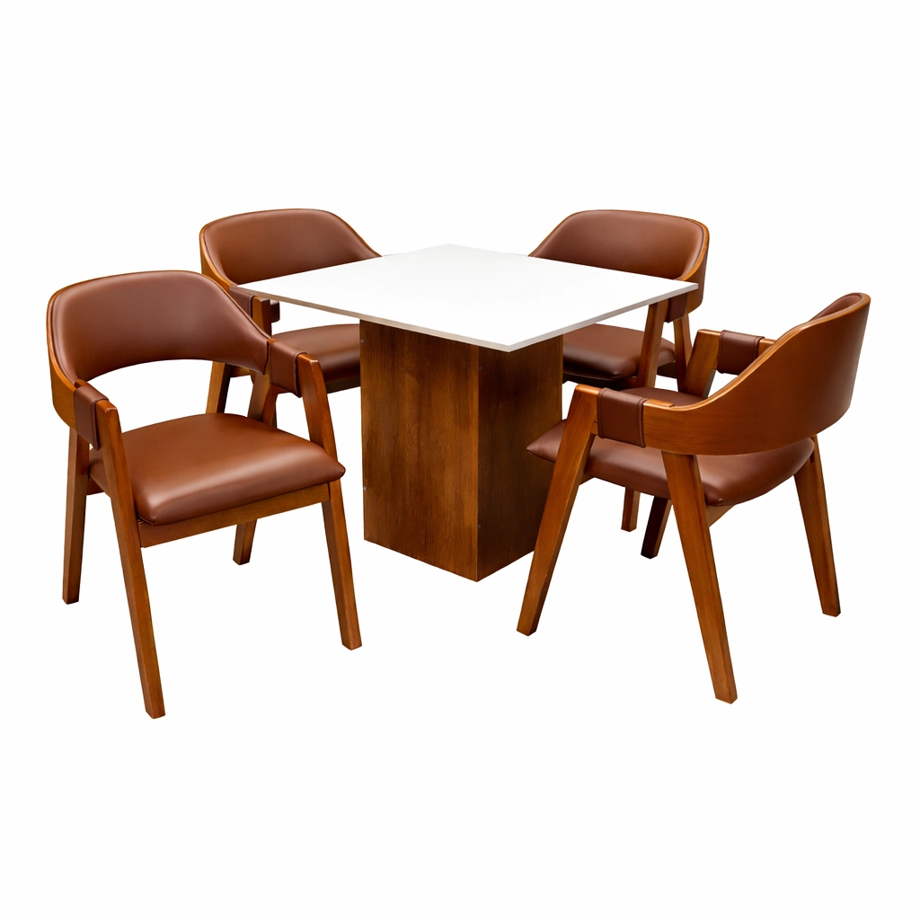 Mesa de Jantar Dakota 90x90cm SEM Vidro e 4 Cadeiras Perola em Corino Madeira Cel Móveis