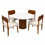 A elegante Mesa de Jantar Dara 110cm Redonda com Vidro e 4 Cadeiras Barcelona em Linho Madeira LJ Móveis cria um ambiente acolhedor e funcional. A mesa apresenta um tampo redondo de 110cm, ideal para otimizar o fluxo de movimento em espaços compactos, coroado por um acabamento em vidro que facilita a higienização e amplia a luminosidade do ambiente.
