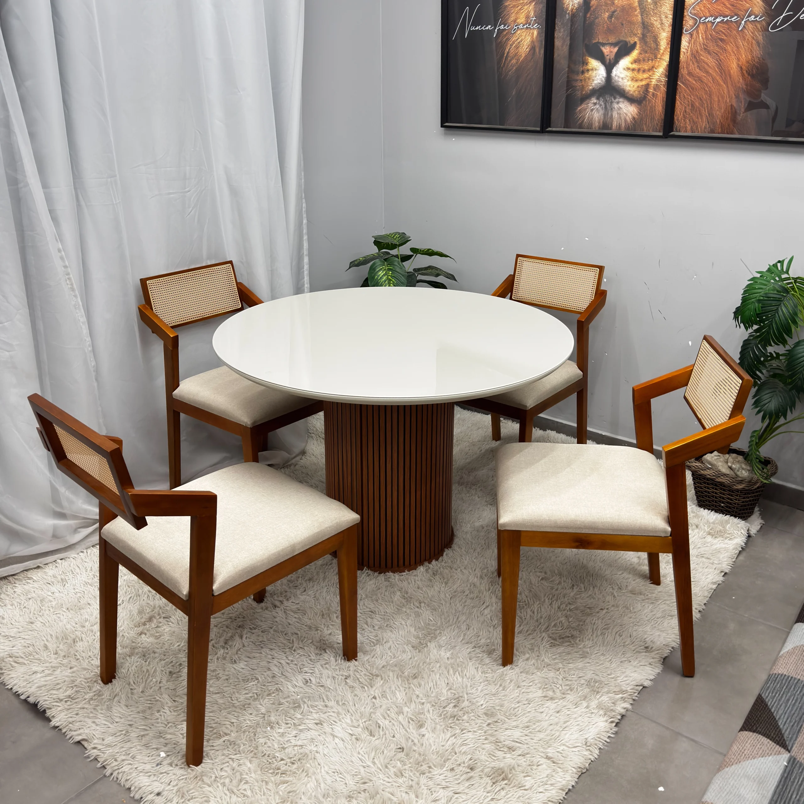 Mesa de Jantar Dara 110cm Redonda com Vidro e 4 Cadeiras Berlim HR em Linho Madeira LJ Móveis