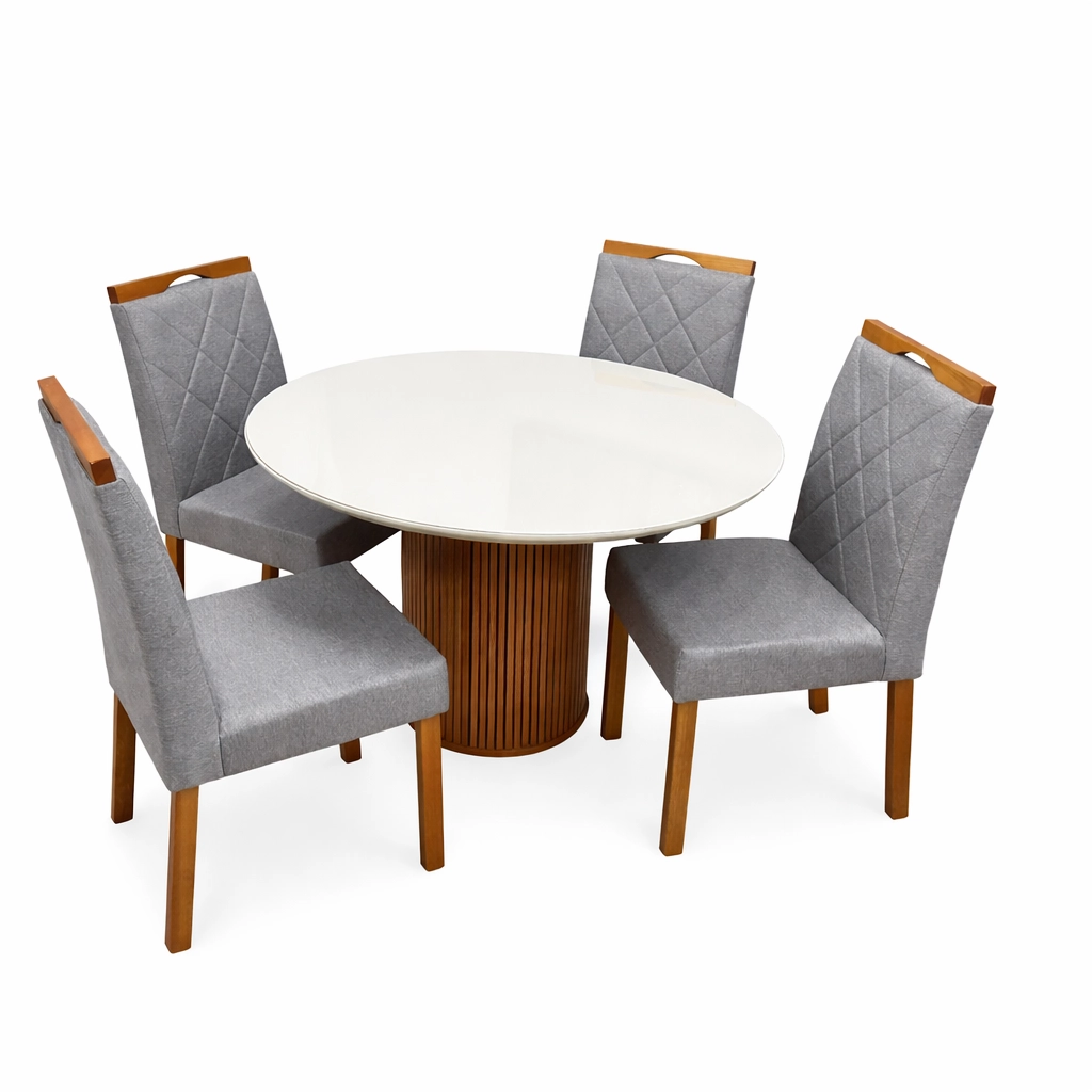 | Modelo | Mesa de Jantar Dara 110cm Redonda com Vidro e 4 Cadeiras California em Linho |