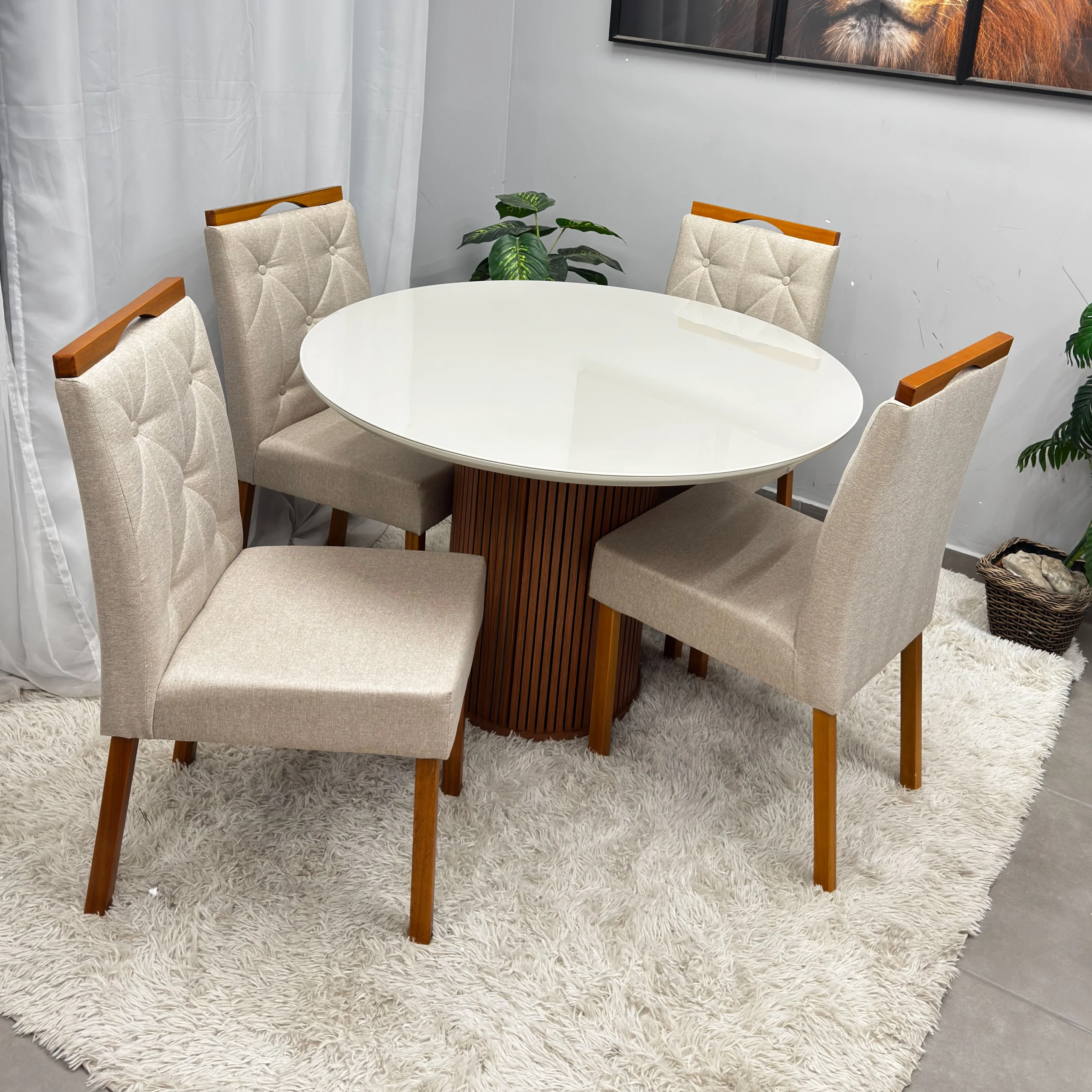 Mesa de Jantar Dara 110cm Redonda com Vidro e 4 Cadeiras Jasmim em Linho Estofadas LJ Móveis