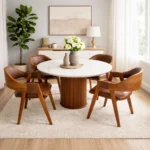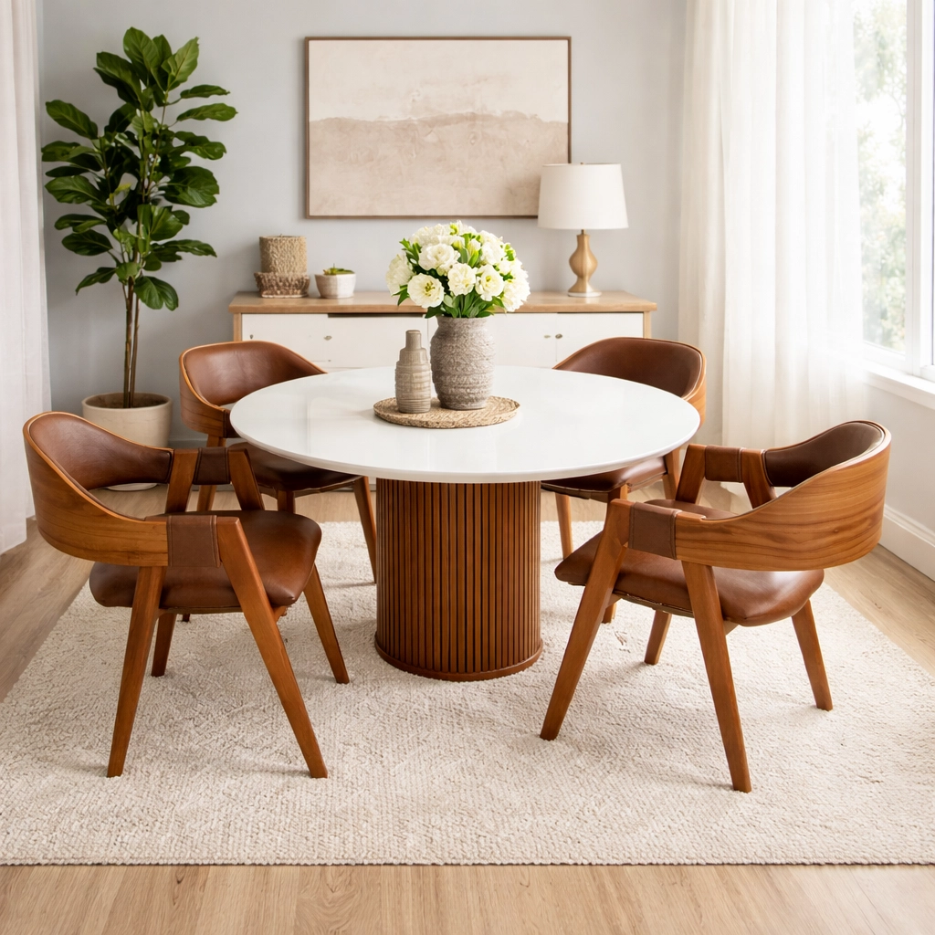A elegante Mesa de Jantar Dara 110cm Redonda com Vidro e 4 Cadeiras Perola em Corino Madeira LJ Móveis cria um ambiente acolhedor e funcional. A mesa apresenta um tampo redondo de 110cm, ideal para otimizar o fluxo de movimento em espaços compactos, coroado por um acabamento em vidro que facilita a higienização e amplia a luminosidade do ambiente.