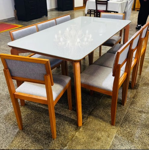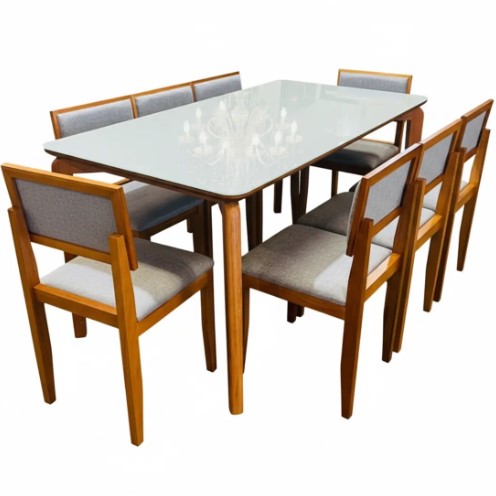 Mesa de Jantar Veneza 180x90cm com 8 Cadeiras Santorini Estofadas Madeira Tecido Linho Minas Plac