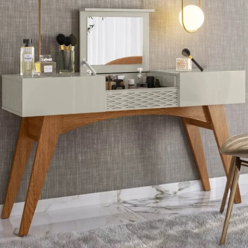 Este móvel vai além de embelezar o ambiente, ele se torna um canto prático onde você pode se arrumar com estilo ou focar nos seus estudos. Seu design refinado e o espelho de alta qualidade garantem a luminosidade ideal para realçar sua aparência, enquanto a superfície acomoda o seu laptop com conforto.