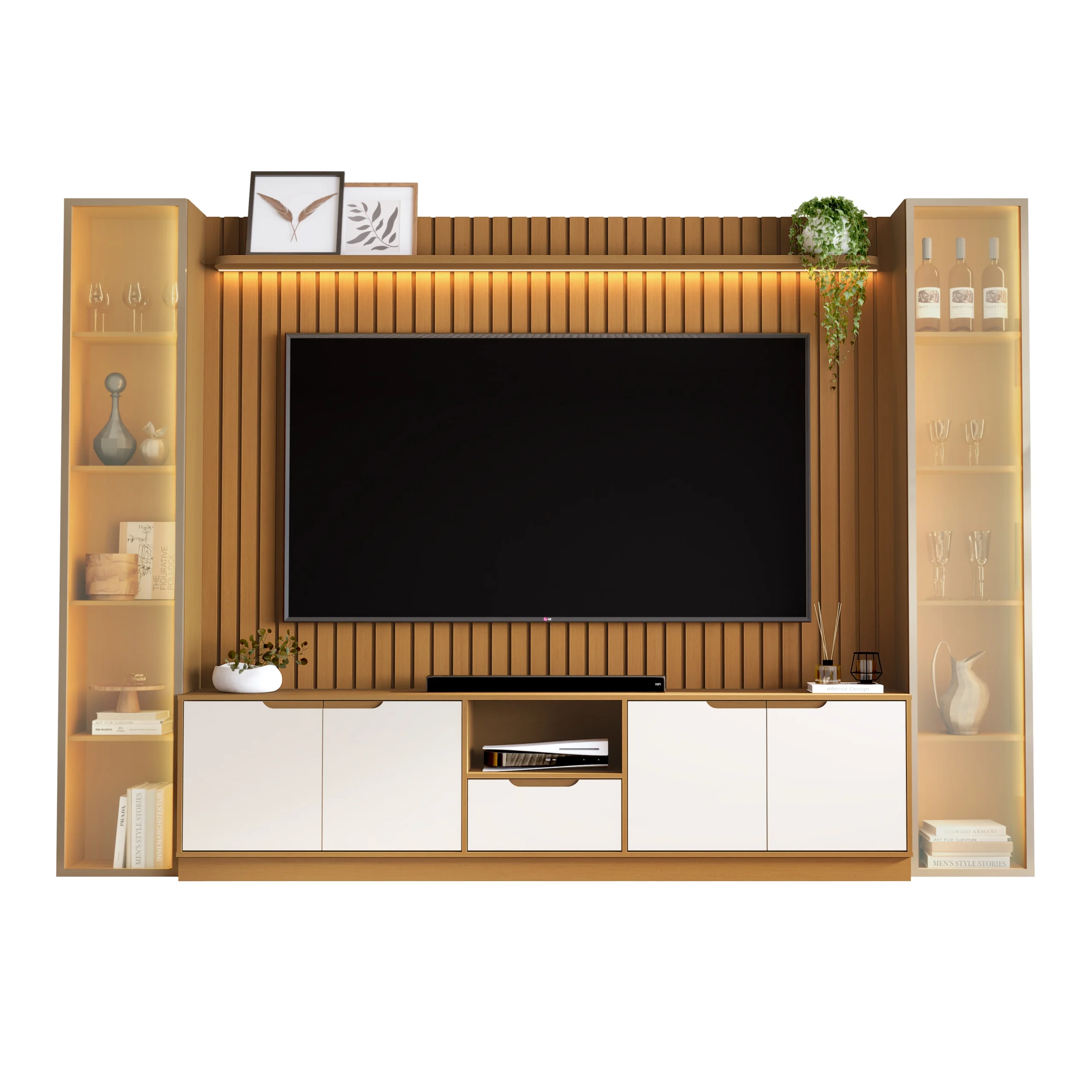 Rack com Painel Tucuma Ripado 230cm com Prateleira 2 Torres e LED 6 Portas 1 Gaveta JB Bechara