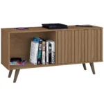O toque final do modelo é a porta que oferece espaço de armazenamento adicional, Permitindo que você esconda seus controles remotos, acessórios de TV e outros itens, mantendo seu espaço organizado e livre de bagunça.