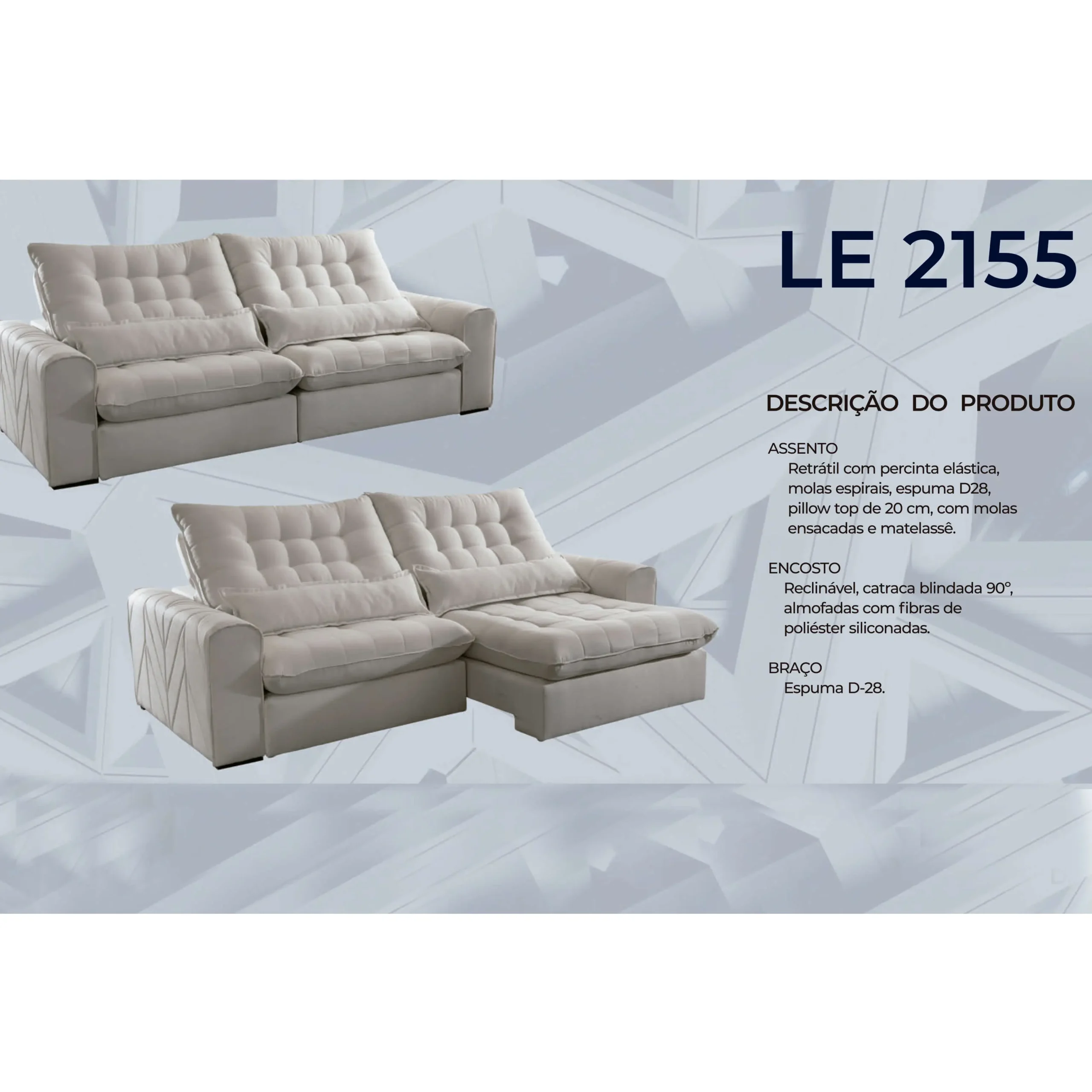 | Assento | Retrátil com percinta elástica, molas espirais, espuma D28, com Molas Ensacadas e Matelassê |