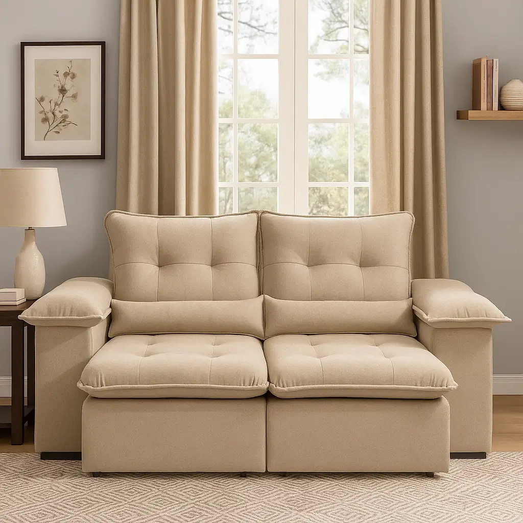 A versatilidade é o ponto forte do Sofá Arsenal: o sistema retrátil permite estender o assento, transformando-o em uma chaise confortável para você esticar as pernas. O encosto, preenchido com fibra siliconada para um apoio suave, é reclinável em até 4 posições, permitindo que você encontre o ângulo ideal para ler ou assistir TV. Com 200cm de largura, ele acomoda três pessoas com conforto, sendo a escolha inteligente para quem busca um design moderno, qualidade e durabilidade em um só produto. Encontre este e outros modelos para renovar sua casa na Estrela Móveis.