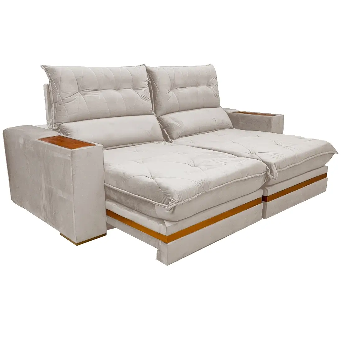 Seus assentos são retráteis, permitindo que você estenda o apoio para as pernas e desfrute de momentos de puro descanso. As almofadas do encosto são reclináveis, o que garante um apoio perfeito para as costas em diversas posições, ideal para ler um livro, assistir a um filme ou simplesmente relaxar.