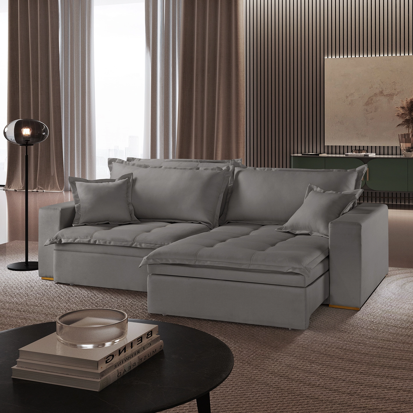 O Sofá Cama com Baú Messina em Linho 4 Lugares Retrátil e Reclinável 230cm Luxury é a união perfeita entre sofisticação e funcionalidade, apresentando um design imponente de 230cm revestido em linho de alta qualidade que eleva a estética de qualquer sala de estar. Com um sistema retrátil e reclinável de 4 lugares, ele oferece o máximo conforto para momentos de lazer, transformando-se facilmente em uma acomodação espaçosa para hóspedes. O grande diferencial fica por conta do baú integrado, uma solução inteligente para organizar mantas e travesseiros, tornando este modelo a escolha ideal para quem busca luxo sem abrir mão da praticidade no dia a dia.