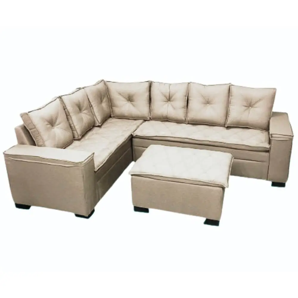 Sofá de Canto Florença 6 Lugares com Puff e Almofadas Soltas Tecido Linho União