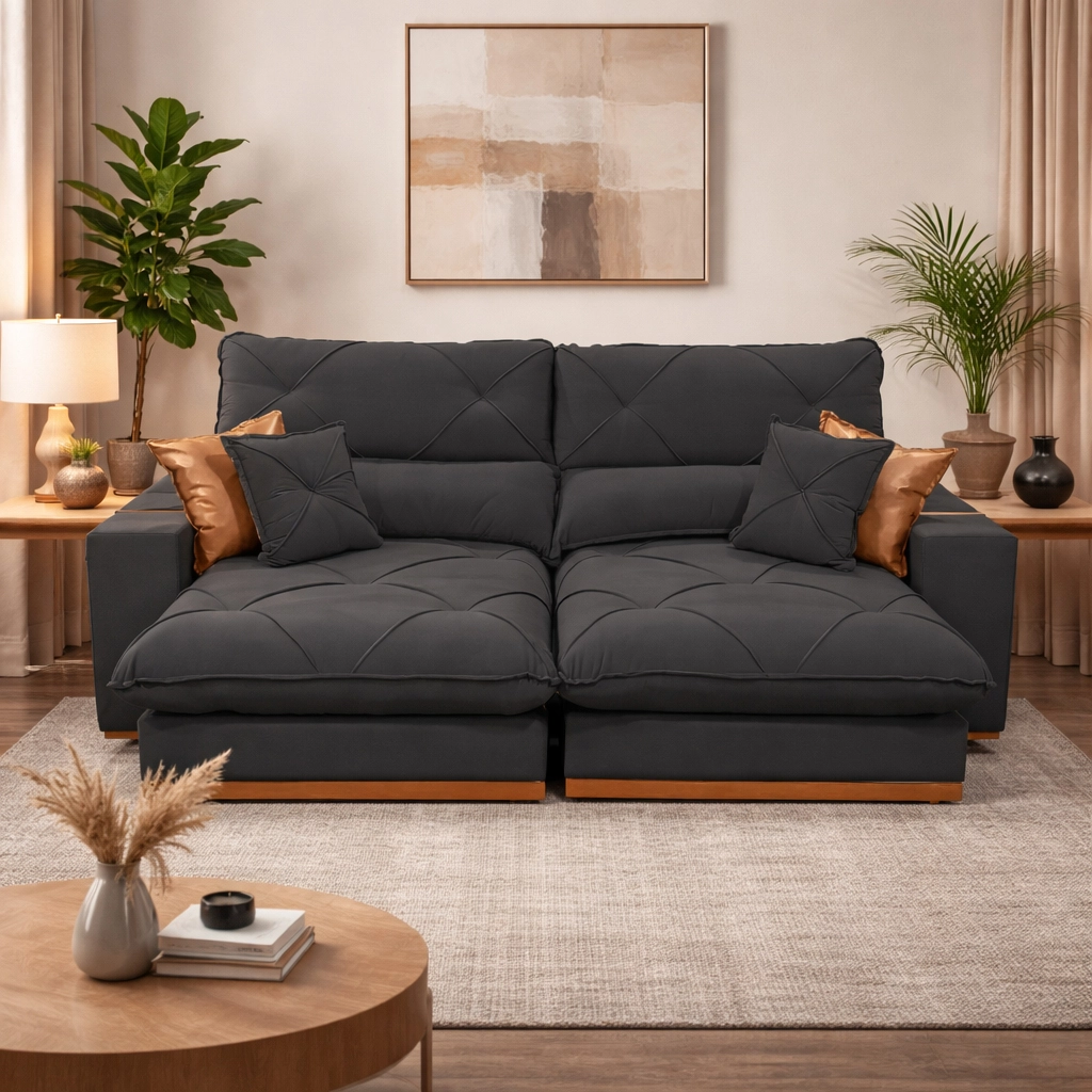 A verdadeira magia, porém, revela-se na experiência de uso: seus assentos retráteis e encostos reclináveis oferecem um convite irresistível ao descanso absoluto, enquanto o sistema premium de molas ensacadas proporciona um suporte ergonômico macio, silencioso e individualizado, abraçando perfeitamente os contornos do seu corpo.