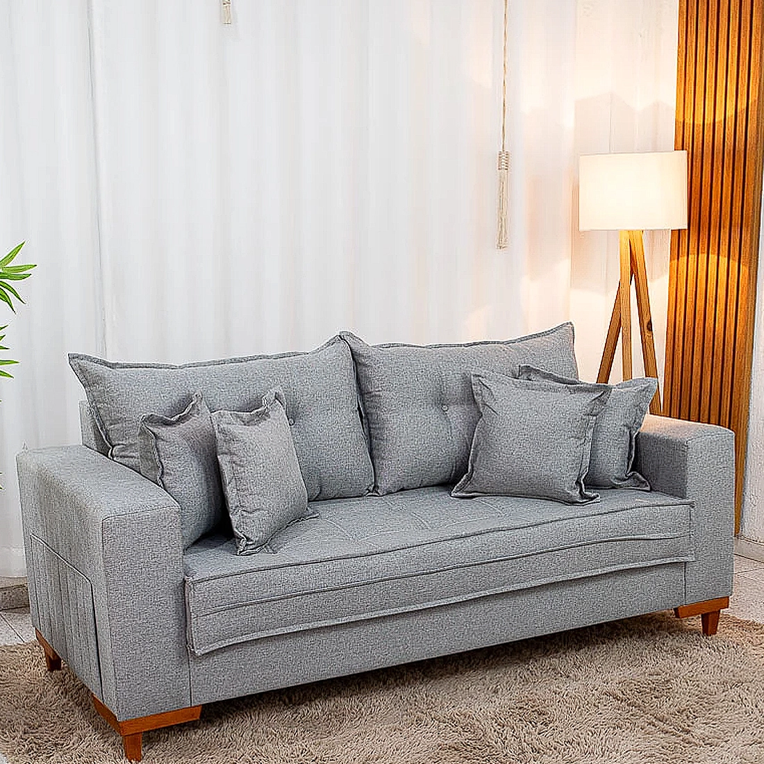 O Sofá Living Portugal em Linho 3 Lugares com Almofadas Soltas 200cm Boareto é a peça central perfeita para quem busca combinar conforto sublime com a elegância discreta do design português. Medindo 200cm, ele oferece três lugares espaçosos e é revestido em um sofisticado tecido Linho, que confere uma textura agradável e durabilidade. Seu design é realçado pelas almofadas soltas no encosto, que permitem personalizar o nível de conforto, e pelos braços laterais com detalhe plissado, garantindo um visual moderno e aconchegante que se integra facilmente a qualquer ambiente de estar.